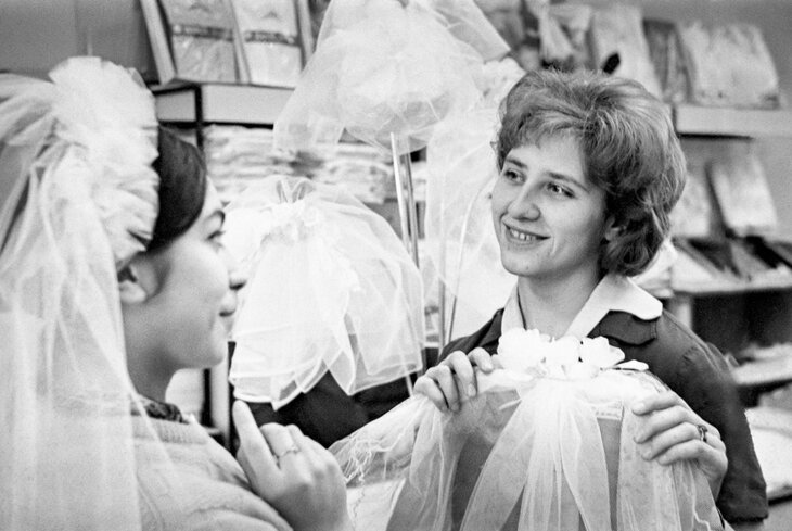 В салоне-магазине для новобрачных продавщица Л. Михалевич предлагает фату покупательнице. Фото И. Савинова. 23 января 1967 года. Главархив Москвы