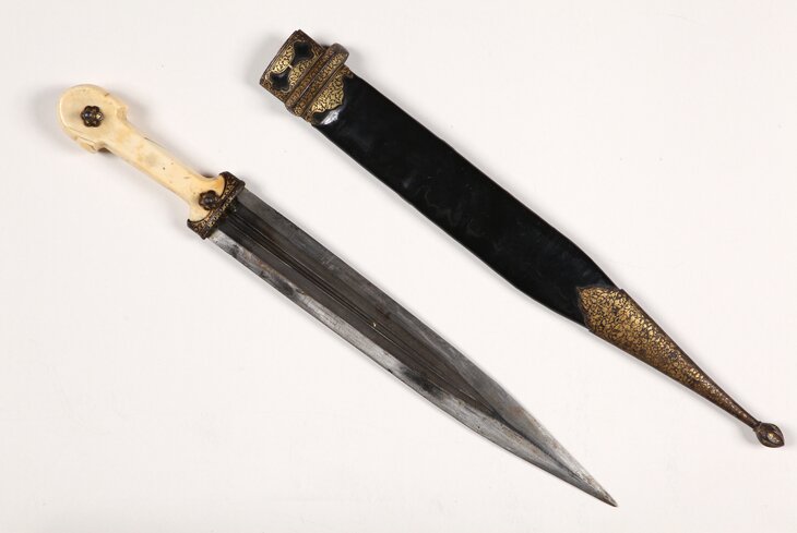 Еще увидите кинжал с ножнами, созданный на Северном Кавказе в начале XX века. Изделие выполнено из стали с использованием слоновой кости и украшено сложными для того времени декоративными техниками: травлением, гравировкой, чернением и золочением.